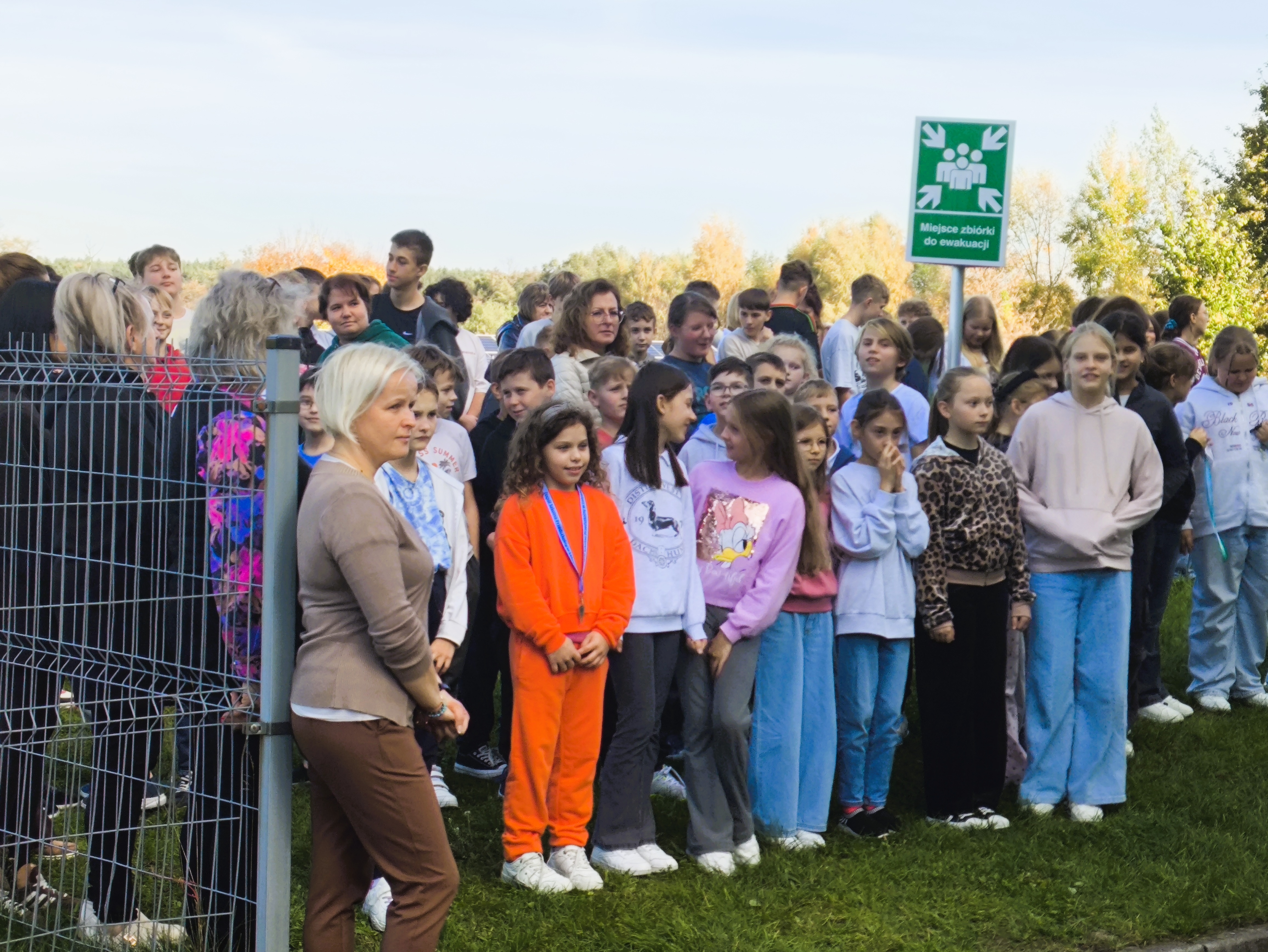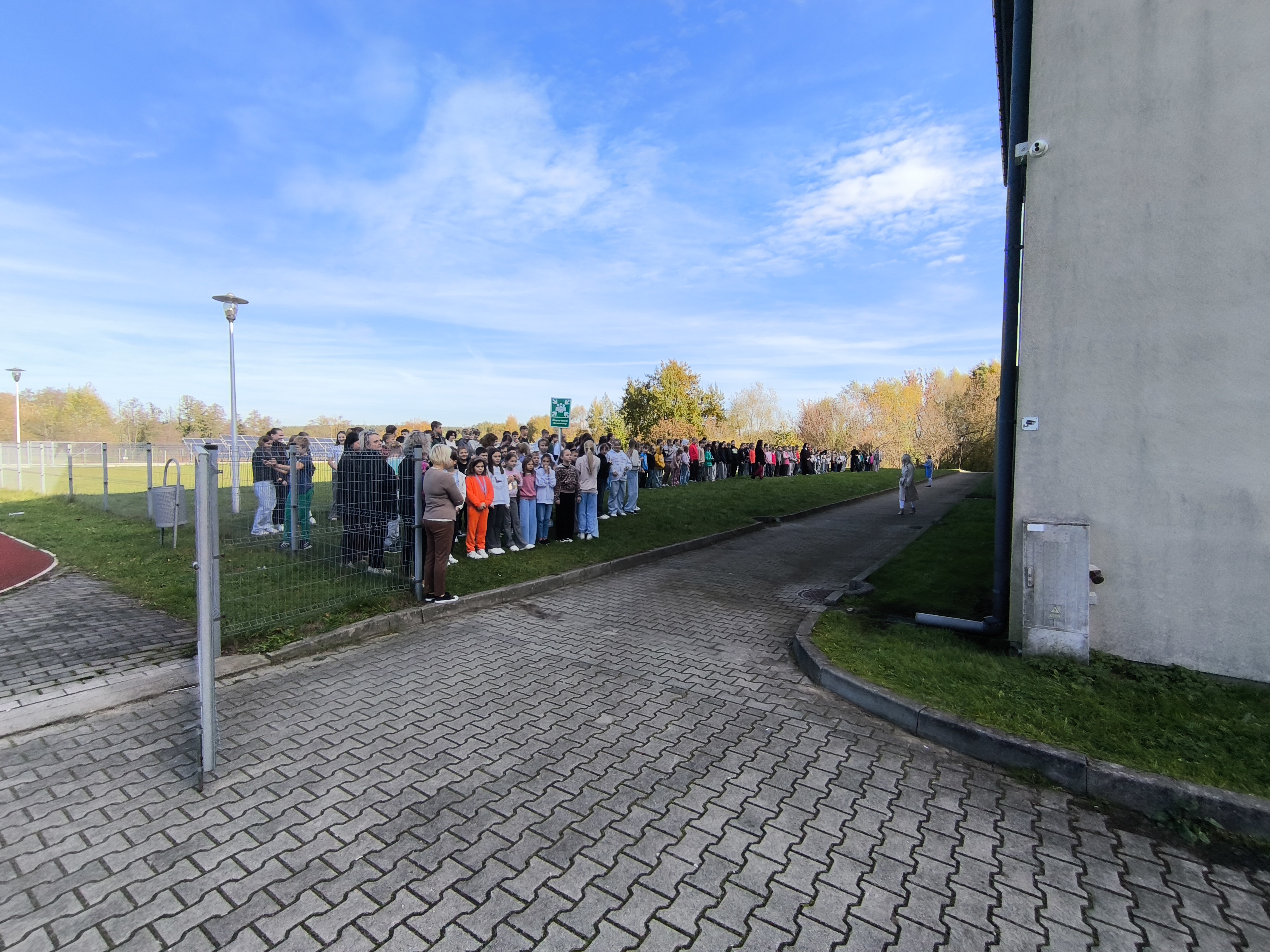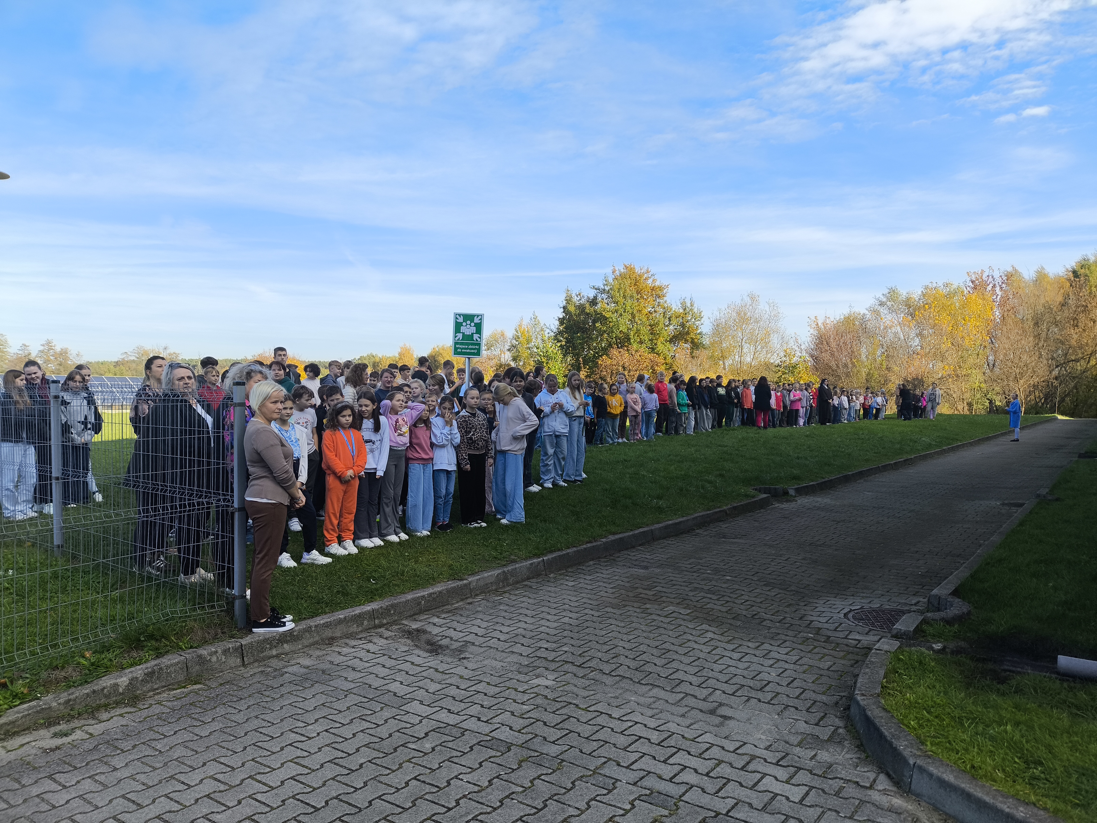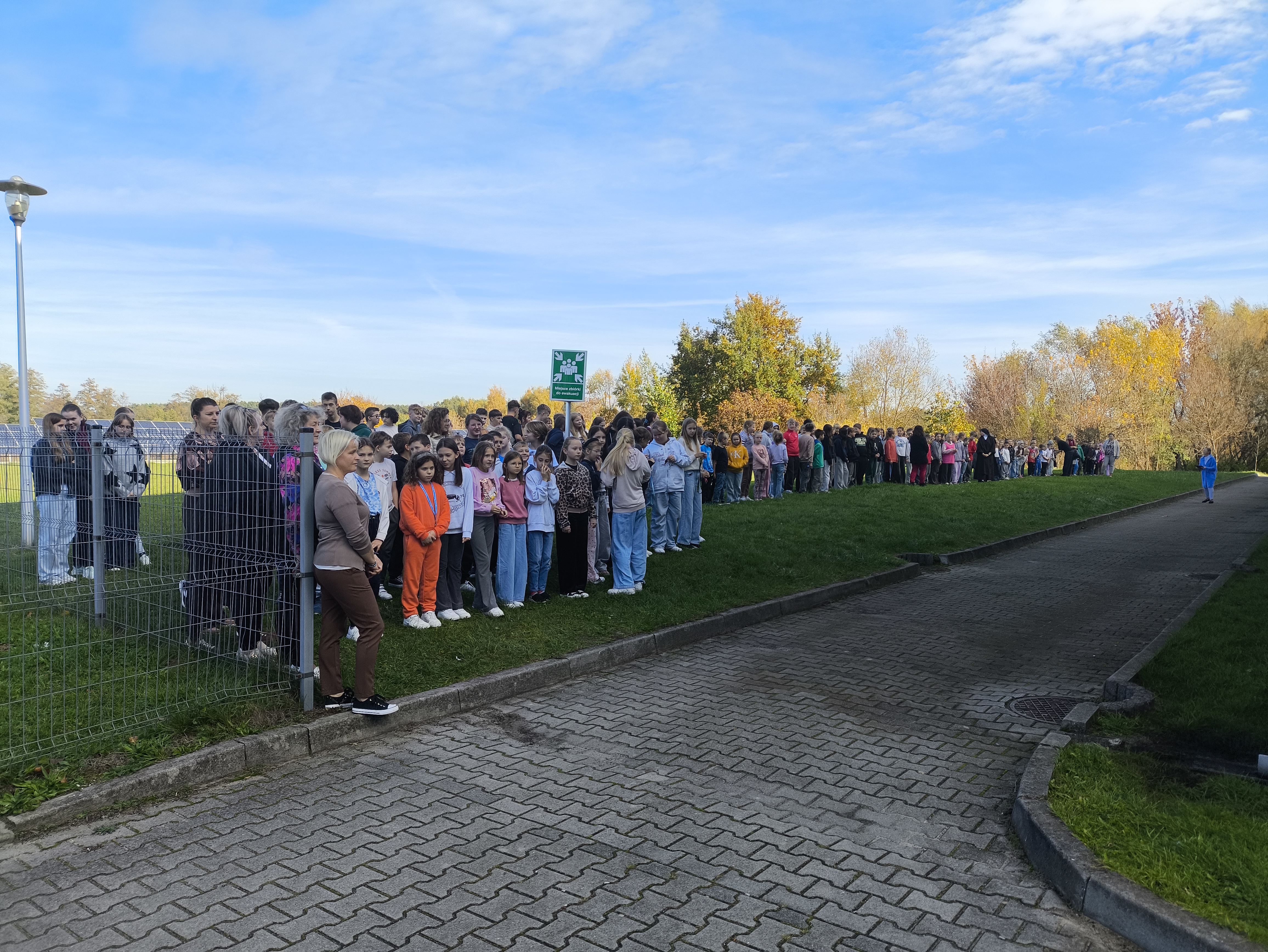 Wszyscy uczestnicy ćwiczenia udali się sprawnie na miejsce zbiórki ewakuacyjnej, wyznaczone za budynkiem szkoły. Na placu obecni byli również pracownicy administracji i obsługi. Po sprawdzeniu obecności przez panią dyrektor Maję Dymińską-Czyż, st. kpt. Mariusz Basiak z PSP w Częstochowie skierował do zebranych kilka słów, przypominając o zasadach bezpieczeństwa, konieczności zachowania spokoju i szybkim reagowaniu w razie rzeczywistego zagrożenia.
