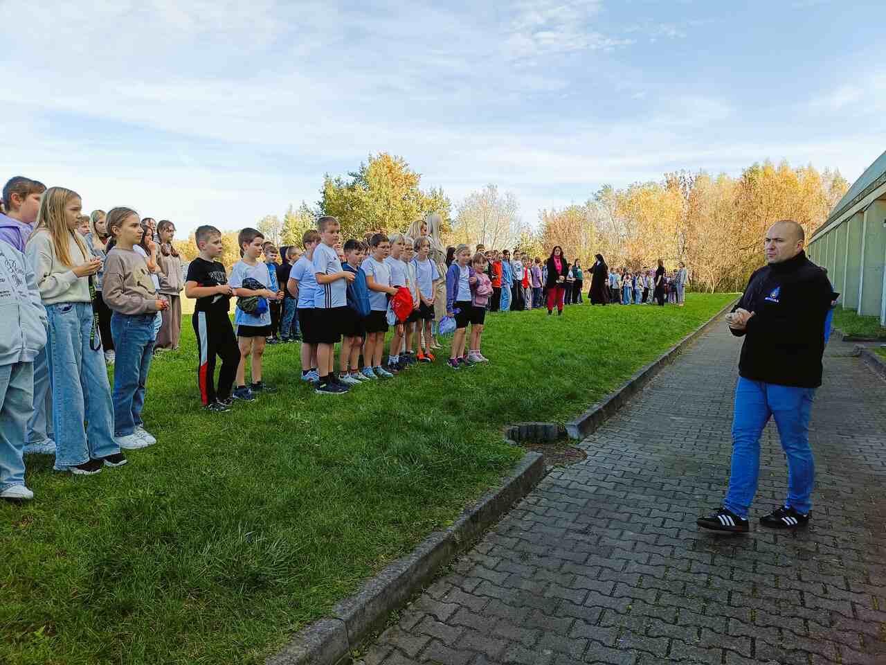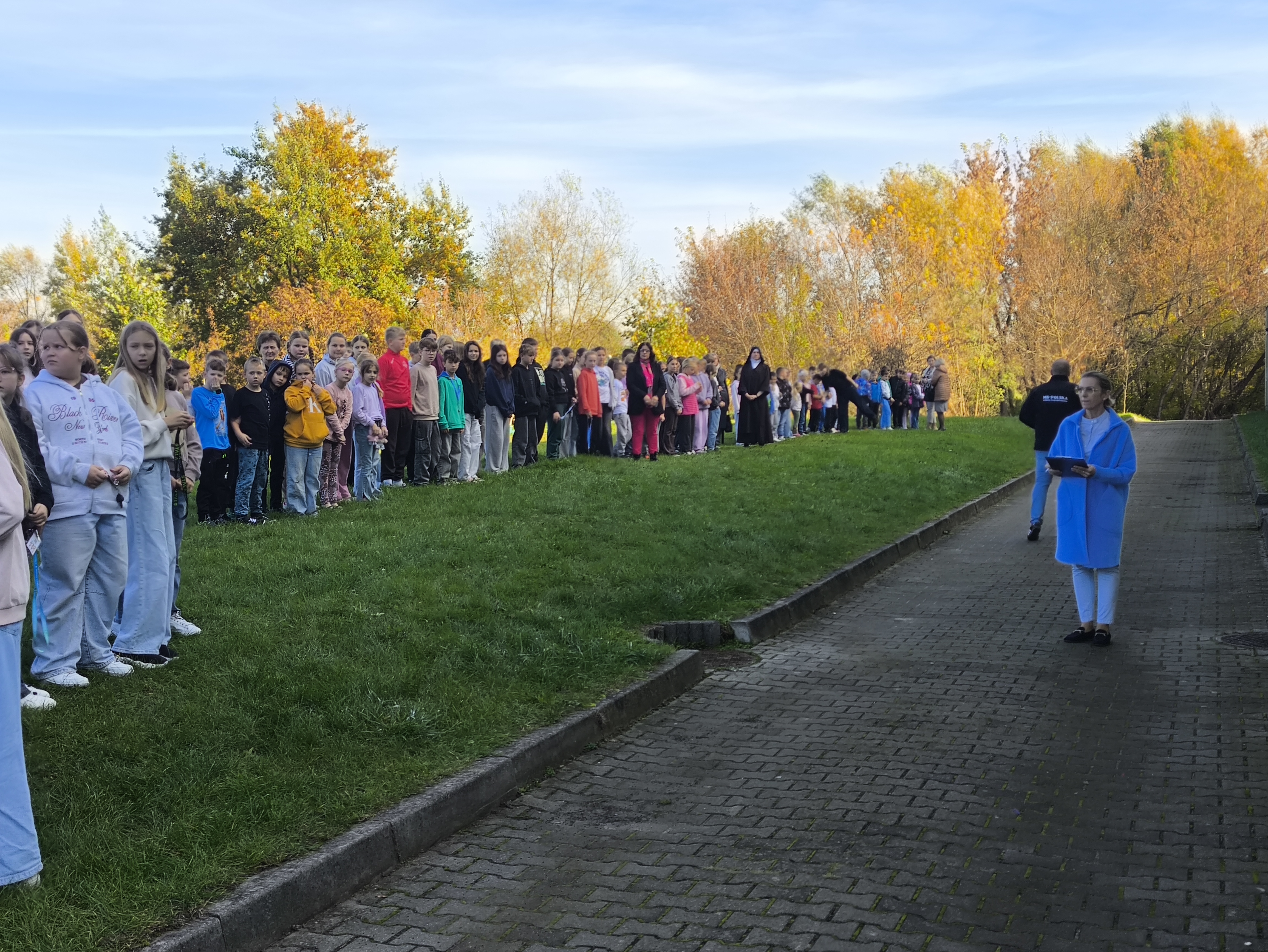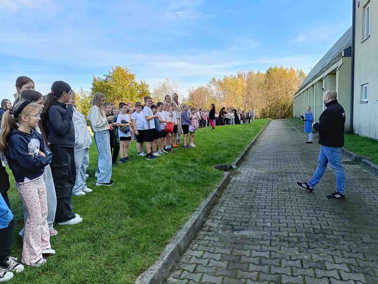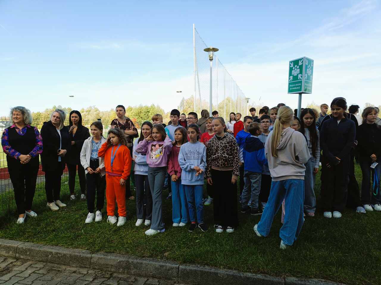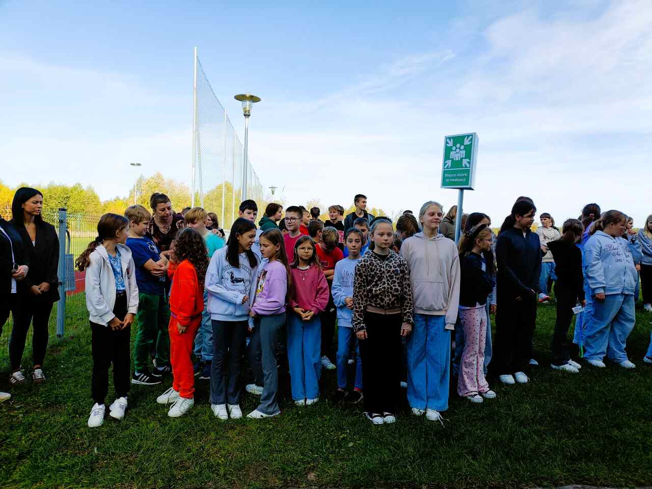 Wszyscy uczestnicy ćwiczenia udali się sprawnie na miejsce zbiórki ewakuacyjnej, wyznaczone za budynkiem szkoły. Na placu obecni byli również pracownicy administracji i obsługi. Po sprawdzeniu obecności przez panią dyrektor Maję Dymińską-Czyż, st. kpt. Mariusz Basiak z PSP w Częstochowie skierował do zebranych kilka słów, przypominając o zasadach bezpieczeństwa, konieczności zachowania spokoju i szybkim reagowaniu w razie rzeczywistego zagrożenia.