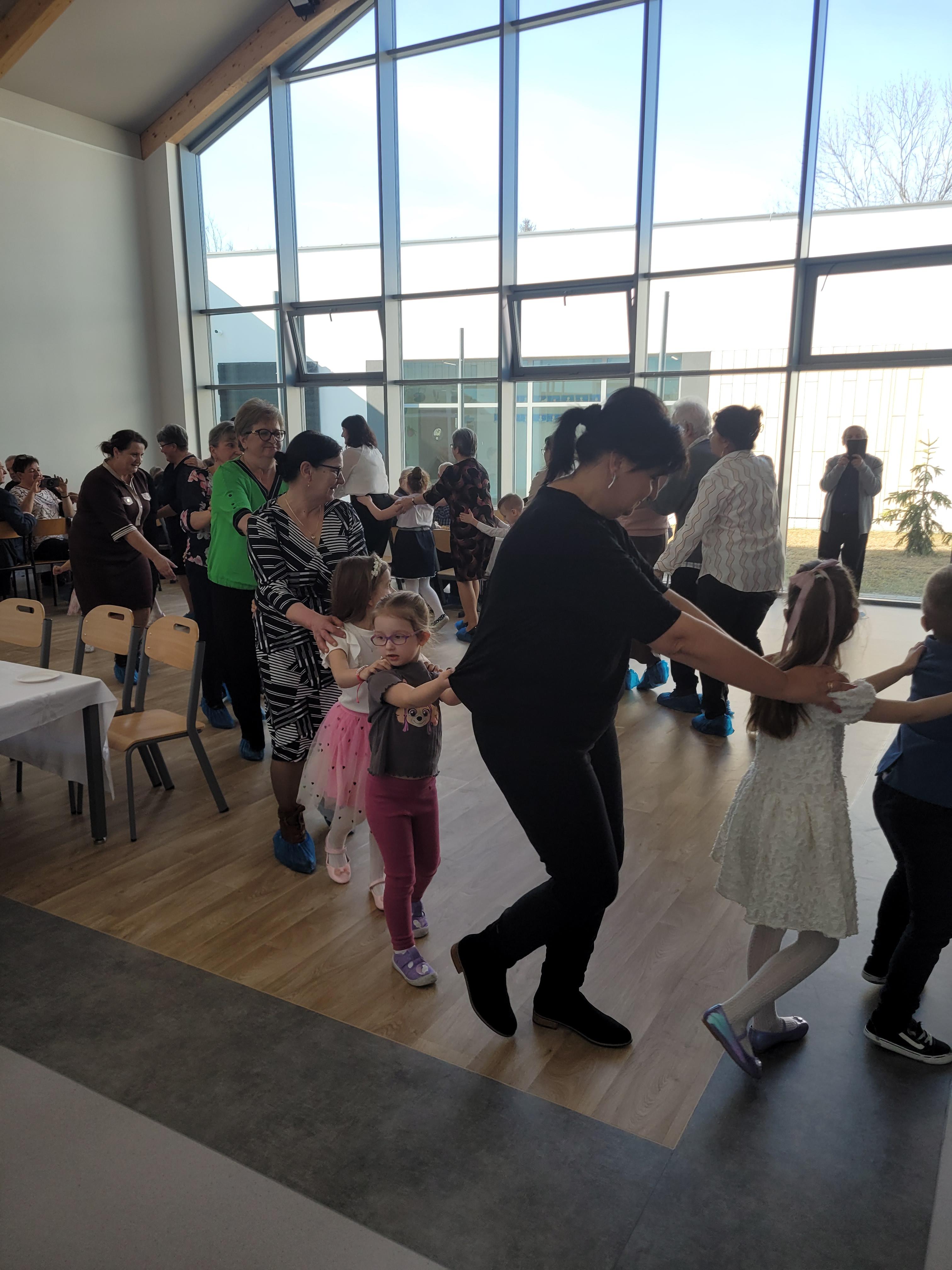 Następnie wszyscy zostali zaproszeni na słodki poczęstunek. Po wspólnych rozmowach przyszedł czas na zabawy integracyjne w kole oraz wspólne tańce, które sprawiły wiele radości zarówno dzieciom, jak i zaproszonym gościom.