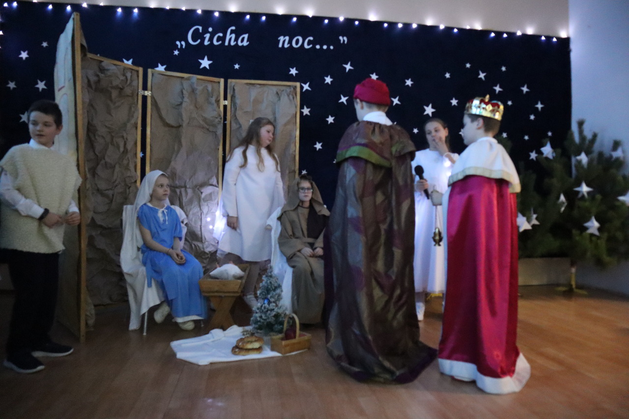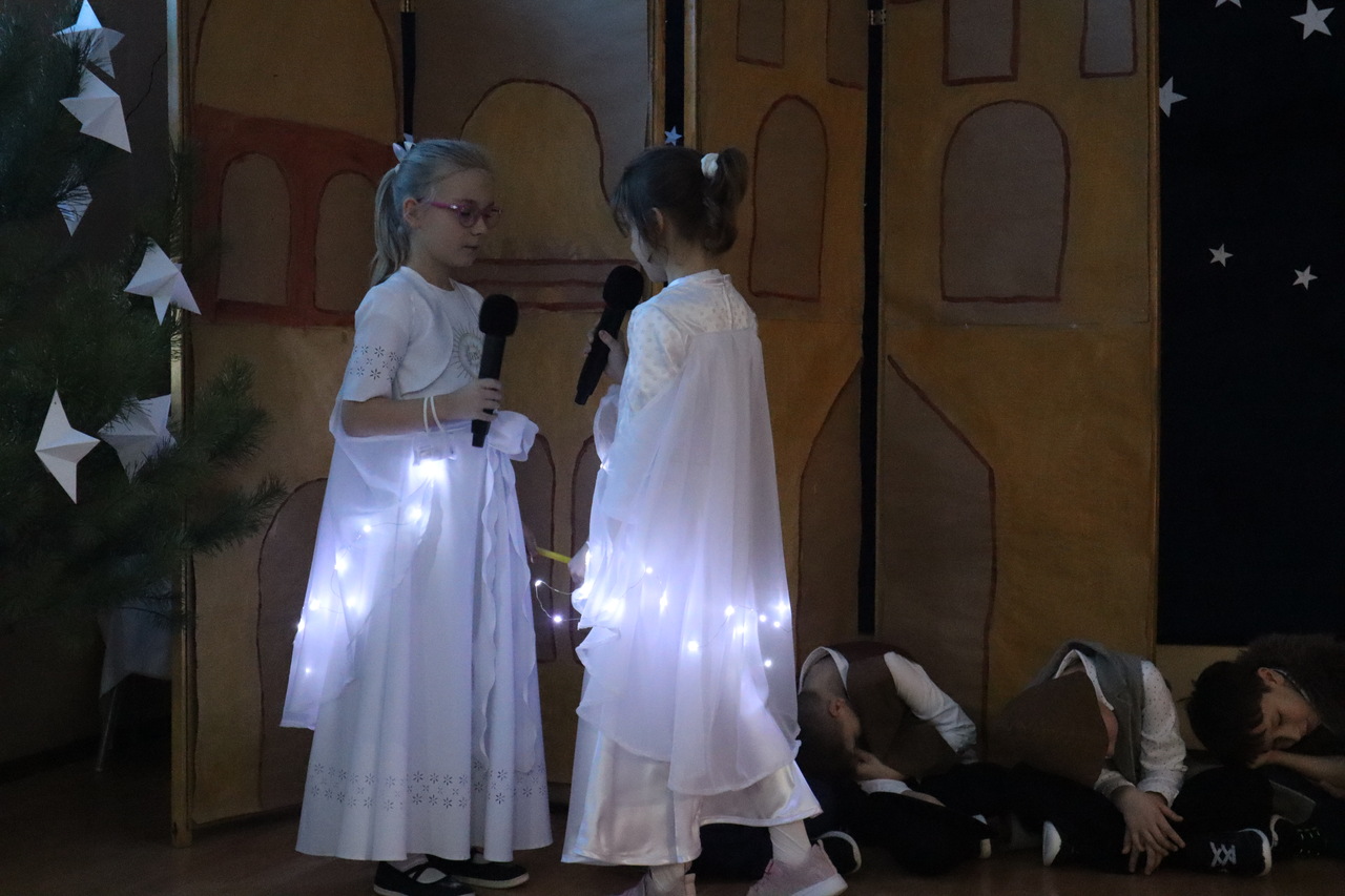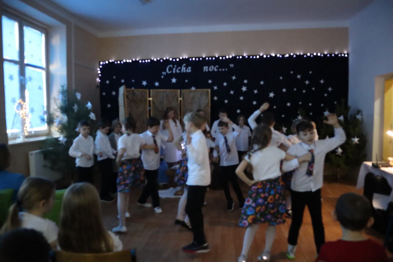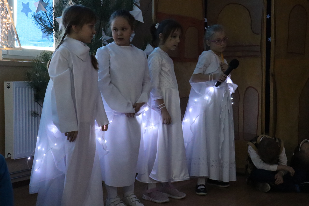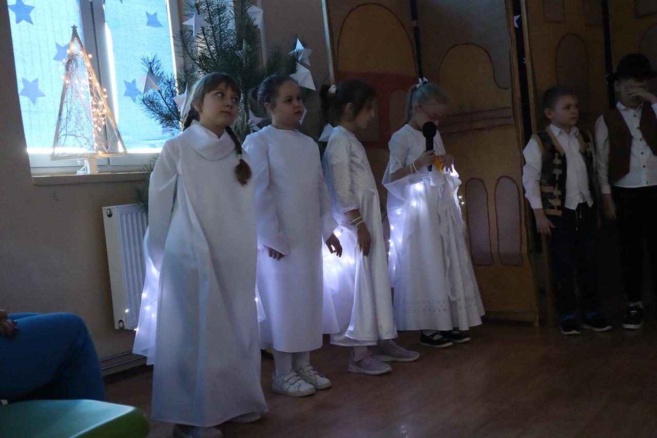 Nastrojowa scenografia stworzyła niezwykłą oprawę dla opowieści o narodzeniu Jezusa. Wzruszający śpiew kolęd i pastorałek w wykonaniu dzieci wprowadził publiczność w prawdziwie bożonarodzeniowy klimat, a radość i autentyczne emocje młodych artystów udzieliły się wszystkim widzom. Szczególnym momentem był pełen energii i tradycji taniec krakowiak, który zachwycił swoją barwnością i wdziękiem.