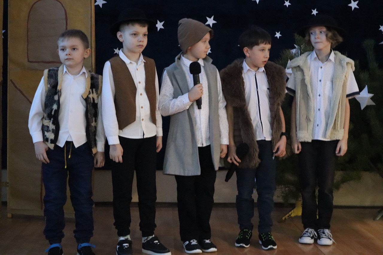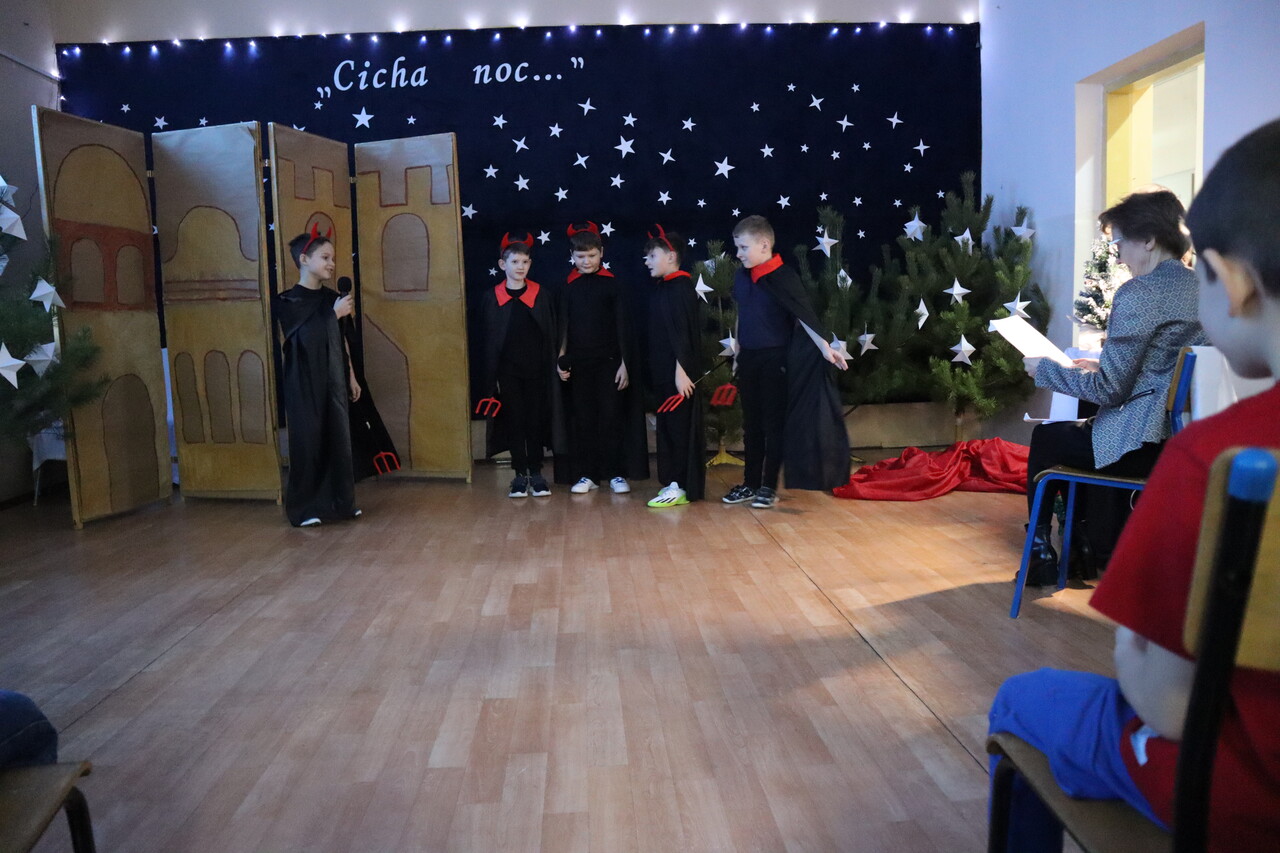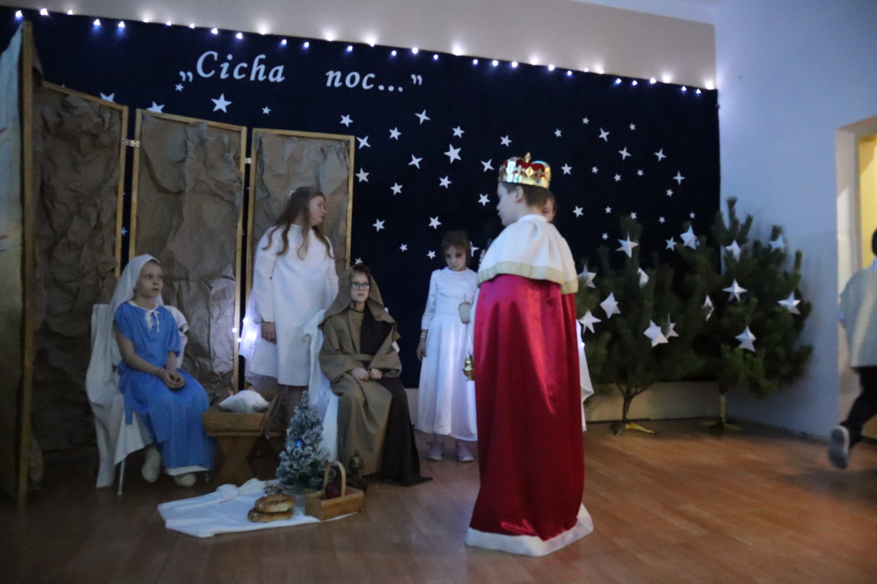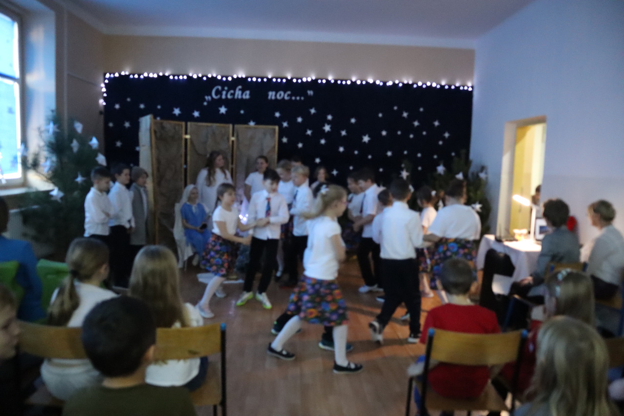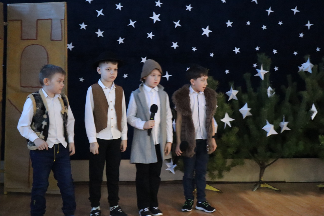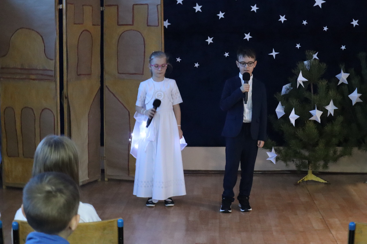 Nastrojowa scenografia stworzyła niezwykłą oprawę dla opowieści o narodzeniu Jezusa. Wzruszający śpiew kolęd i pastorałek w wykonaniu dzieci wprowadził publiczność w prawdziwie bożonarodzeniowy klimat, a radość i autentyczne emocje młodych artystów udzieliły się wszystkim widzom. Szczególnym momentem był pełen energii i tradycji taniec krakowiak, który zachwycił swoją barwnością i wdziękiem.