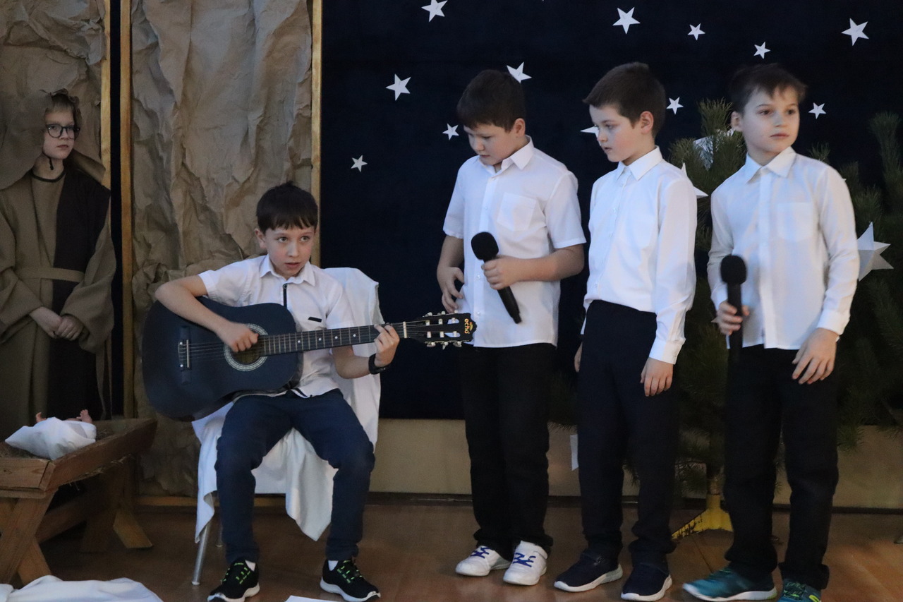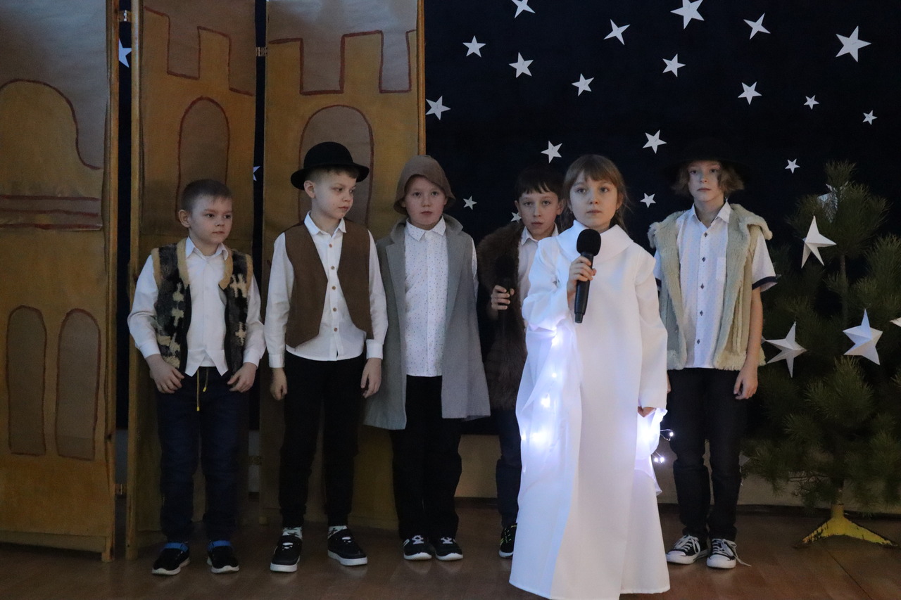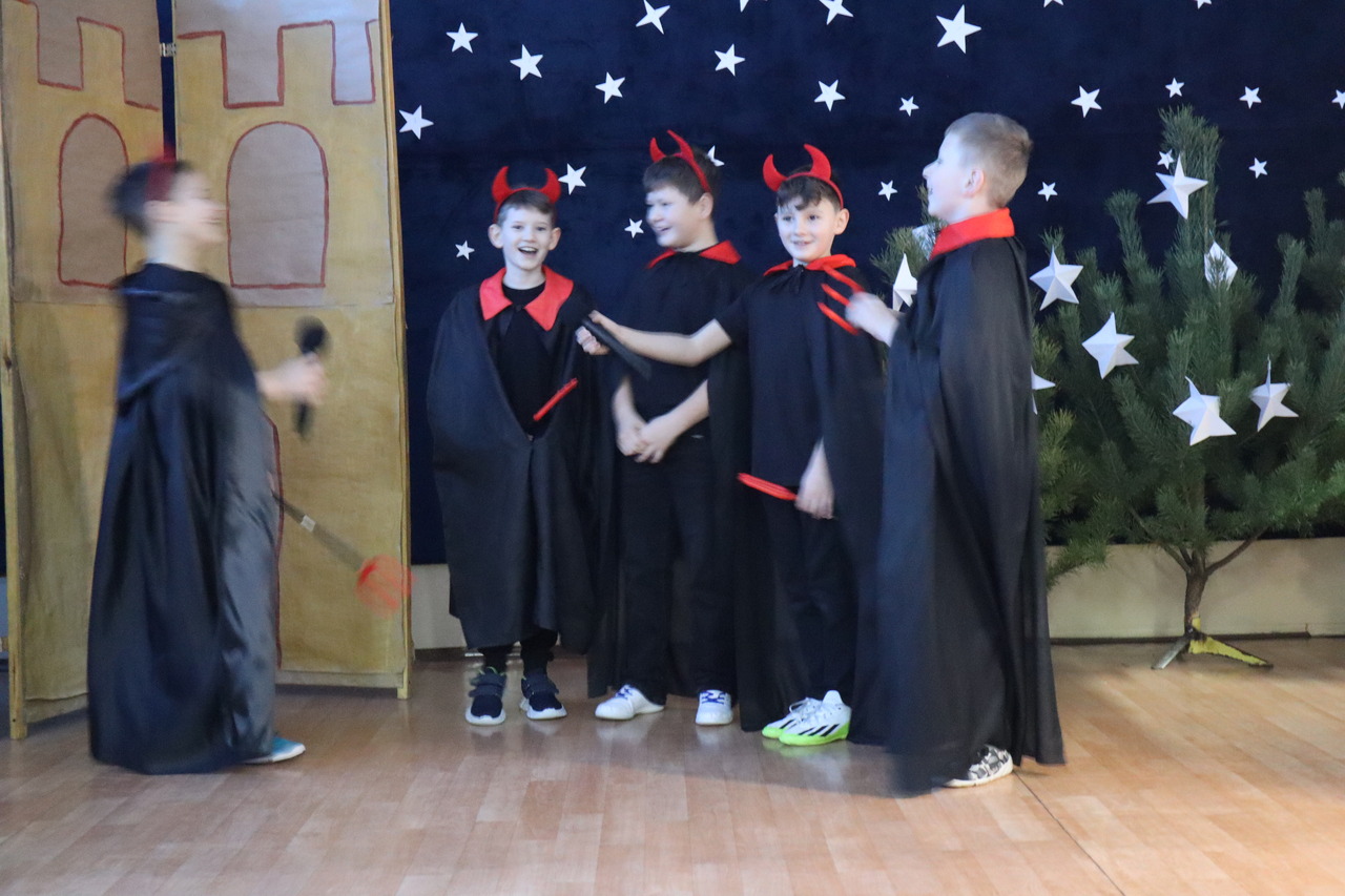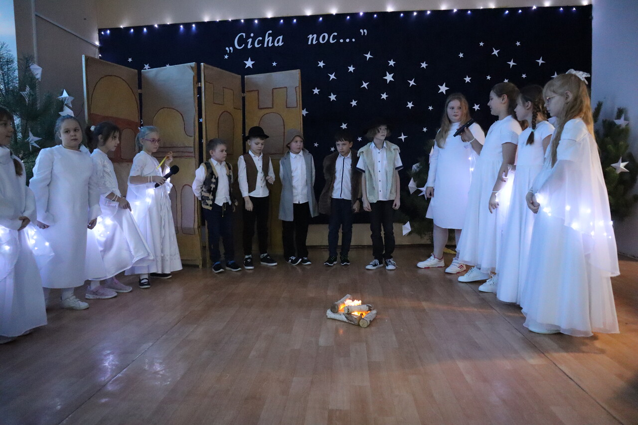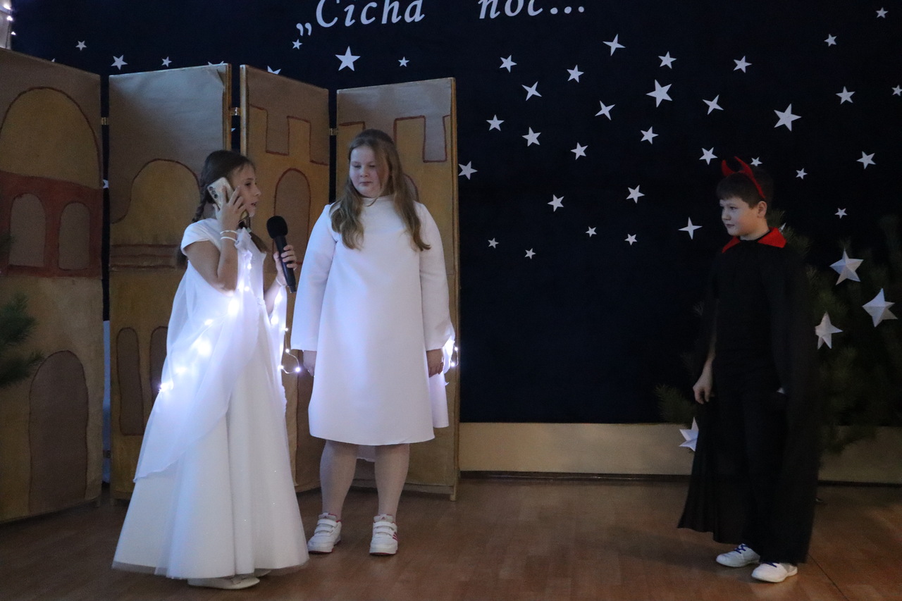 Nastrojowa scenografia stworzyła niezwykłą oprawę dla opowieści o narodzeniu Jezusa. Wzruszający śpiew kolęd i pastorałek w wykonaniu dzieci wprowadził publiczność w prawdziwie bożonarodzeniowy klimat, a radość i autentyczne emocje młodych artystów udzieliły się wszystkim widzom. Szczególnym momentem był pełen energii i tradycji taniec krakowiak, który zachwycił swoją barwnością i wdziękiem.