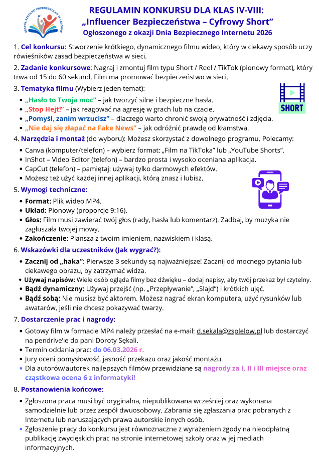 Zapraszamy uczniów klas IV-VIII do udziału w konkursie szkolnym „Influencer Bezpieczeństwa – Cyfrowy Short”, ogłoszonym z okazji Dnia Bezpiecznego Internetu 2026.