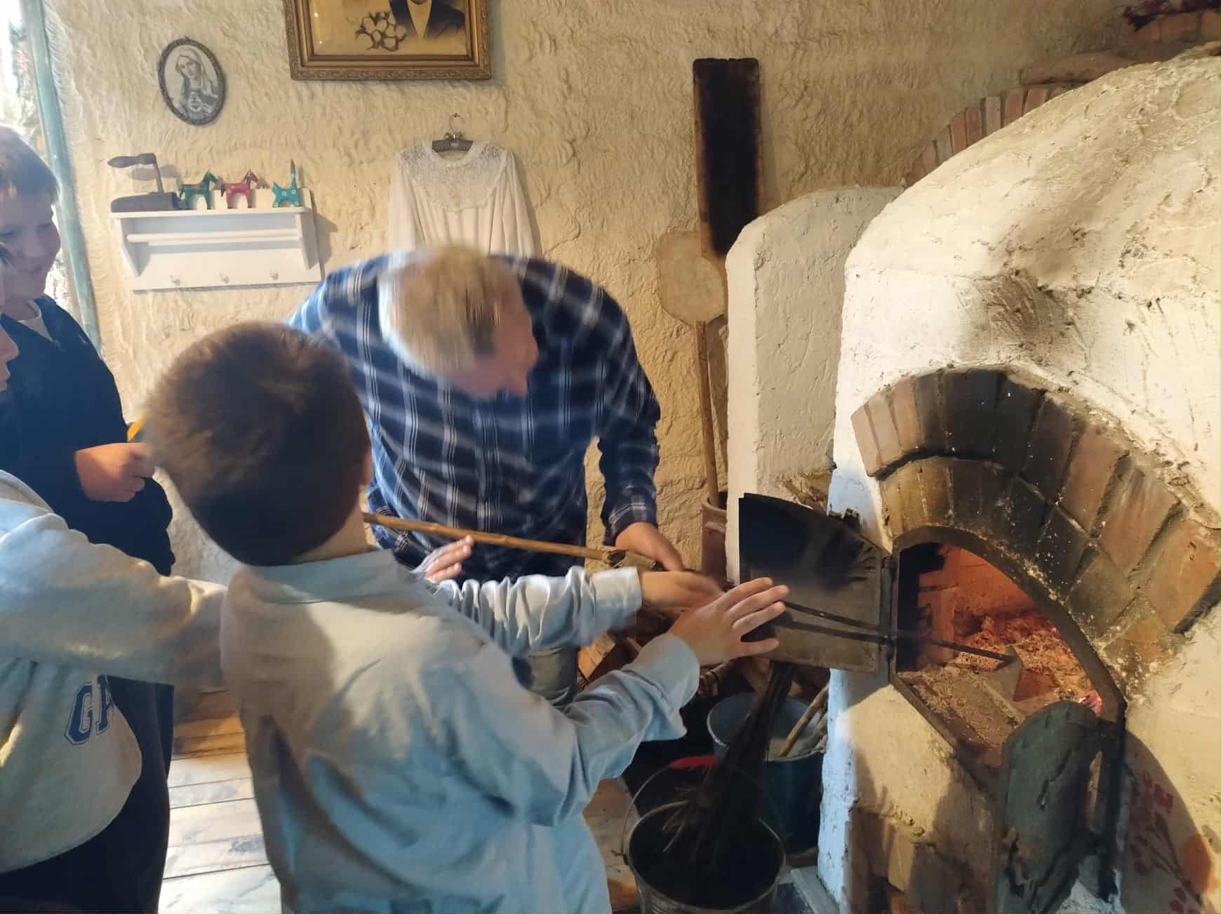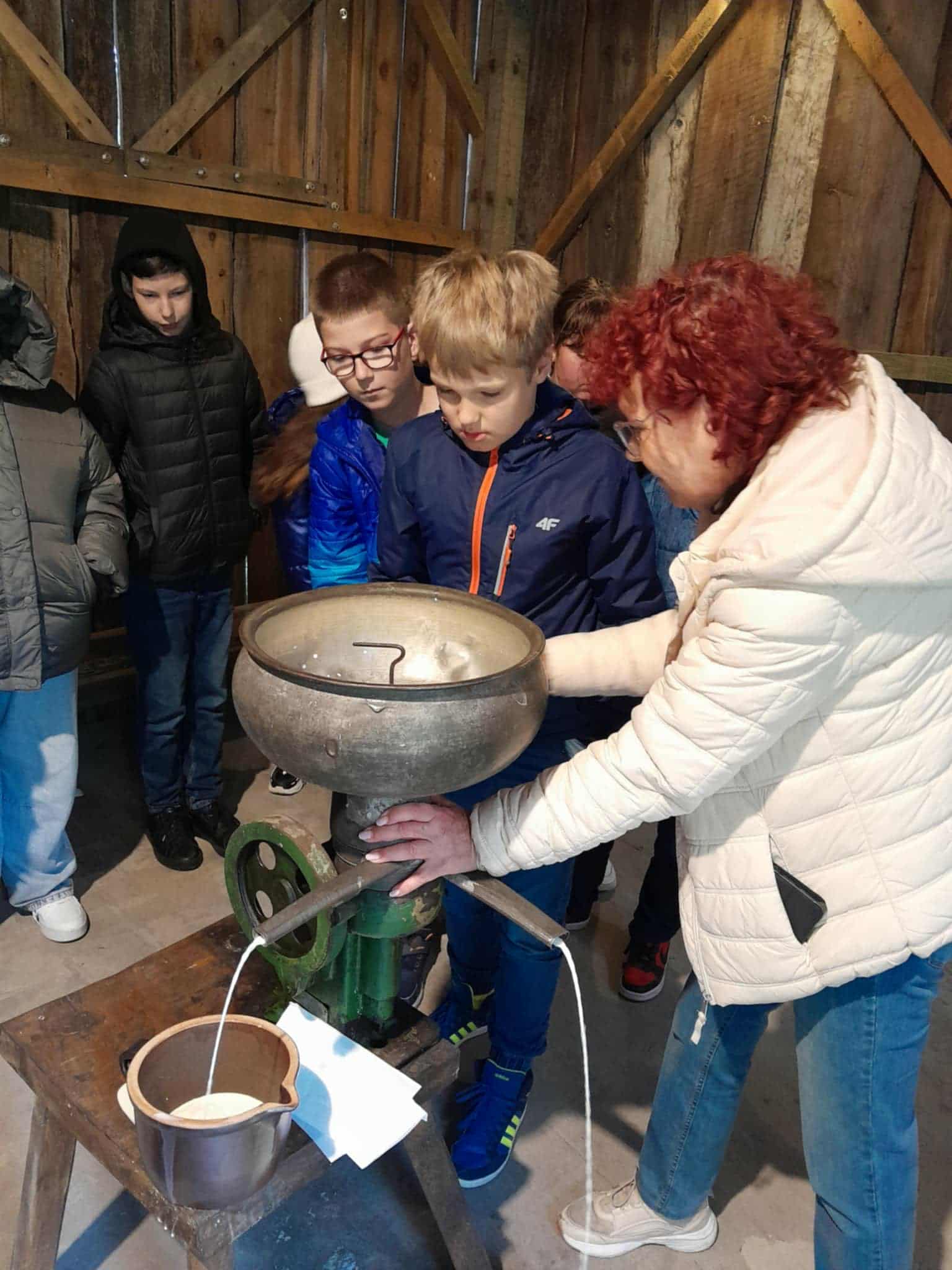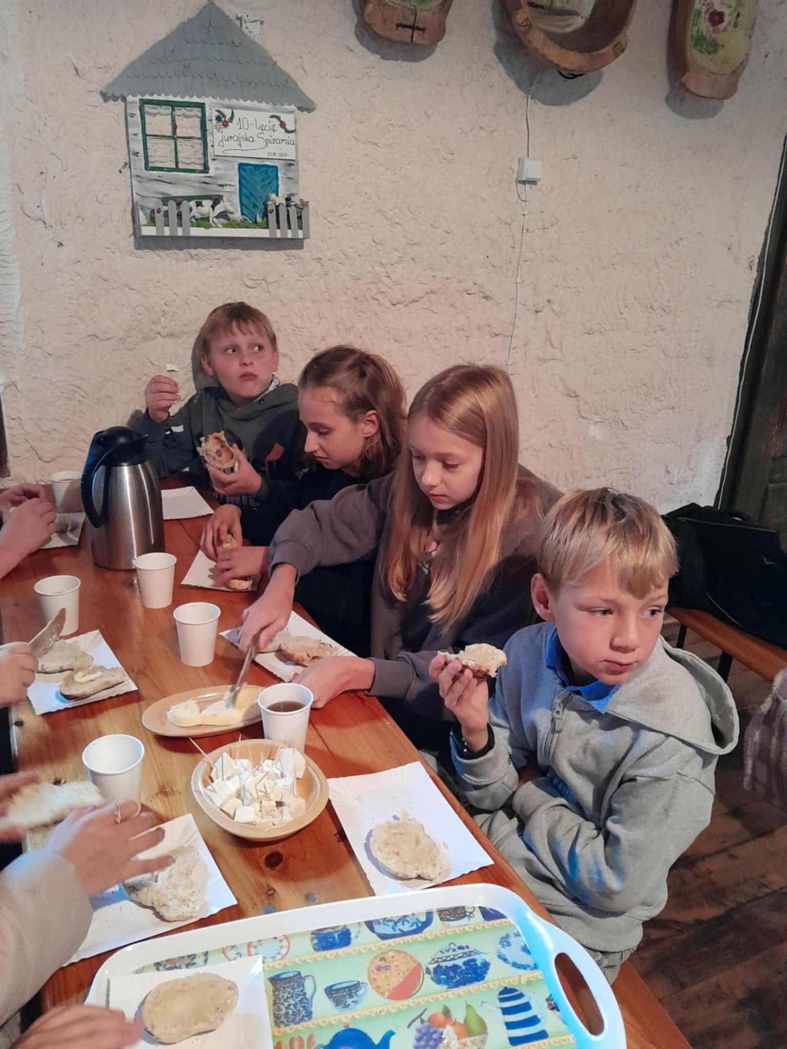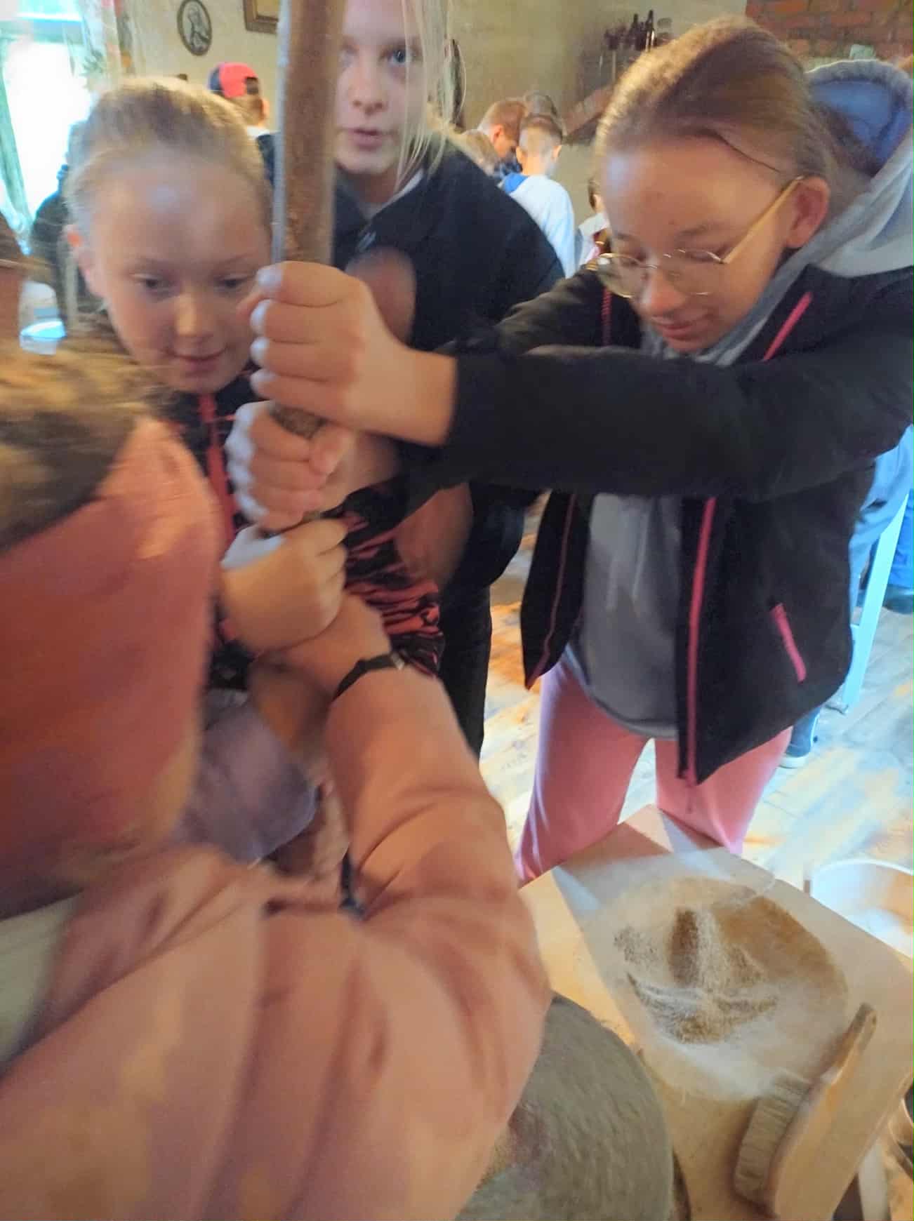 Następnie pojechaliśmy na warsztaty poświęcone tradycjom chłopskim do Białej Wielkiej do „Jurajskiej Spiżarni”. Podczas 3-godzinnego pobytu w gospodarstwie agroedukacyjnym specjalizującym się między innymi w prowadzeniu zajęć pokazujących życia dawnej wsi uczestniczyliśmy w warsztatach z tradycyjnego wypieku chleba, robienia śmietany, masła i sera. Zobaczyliśmy jak można rozniecić ogień za pomocą krzesiwa czy zmielić ziarno na mąkę na starych żarnach.