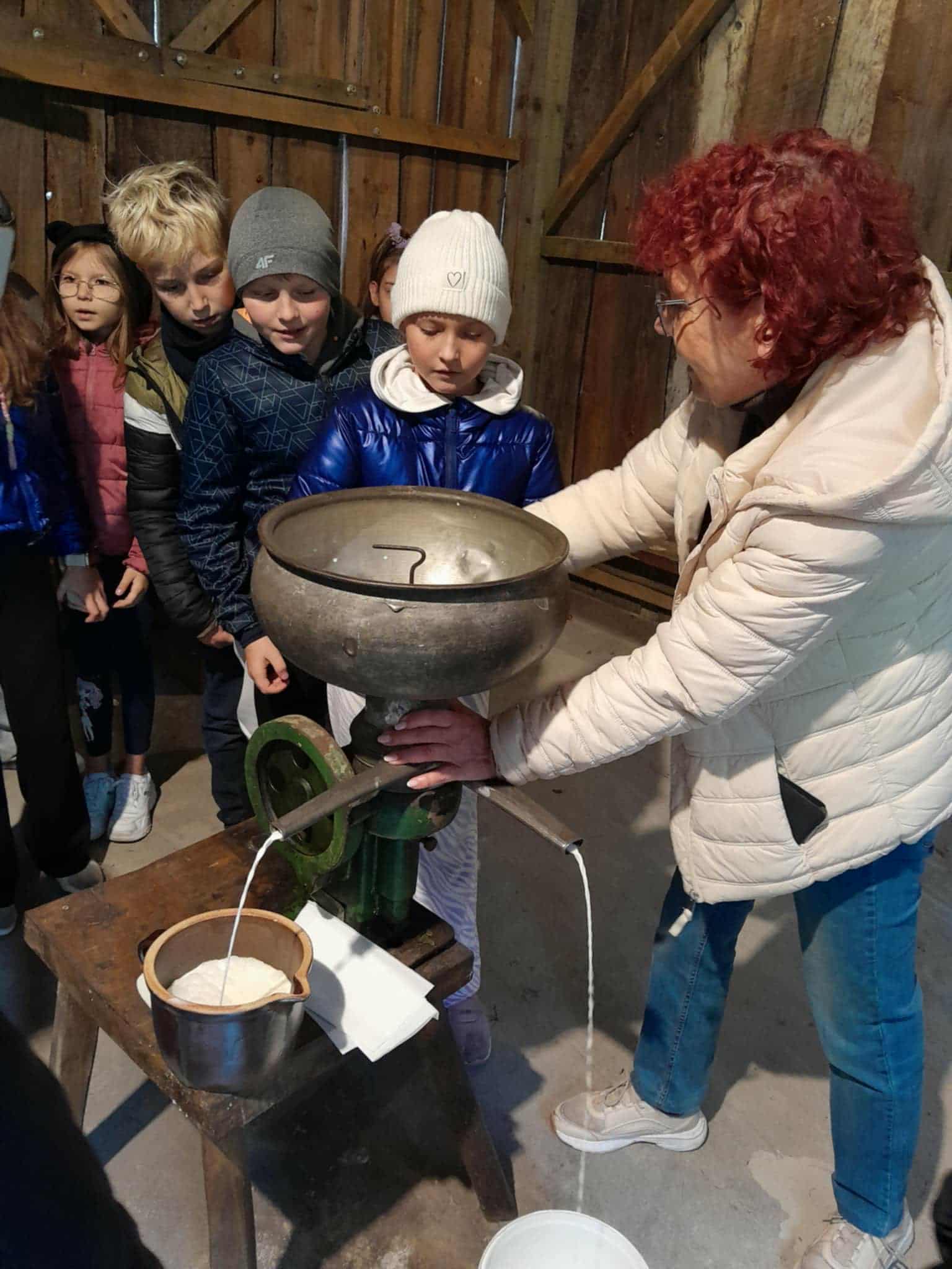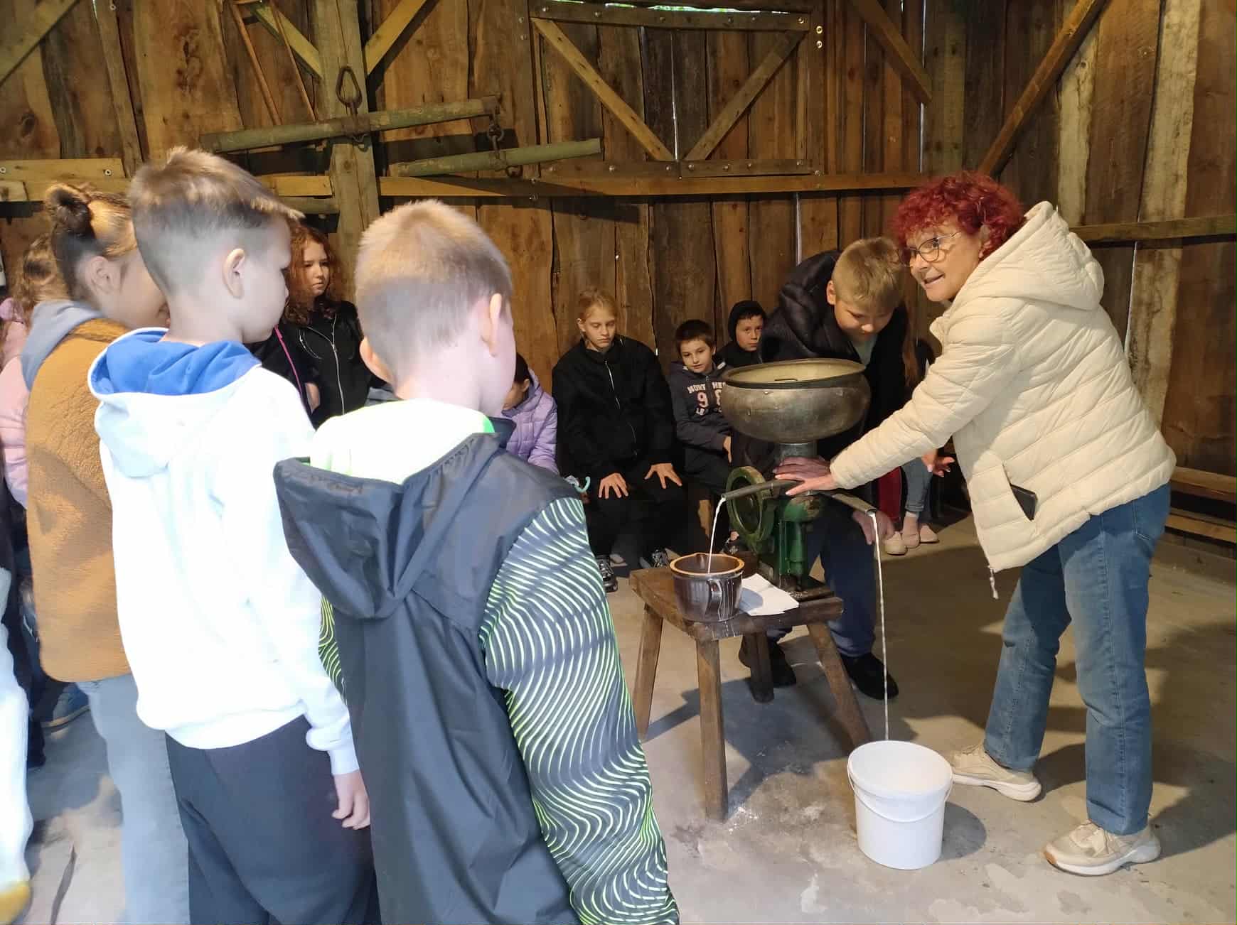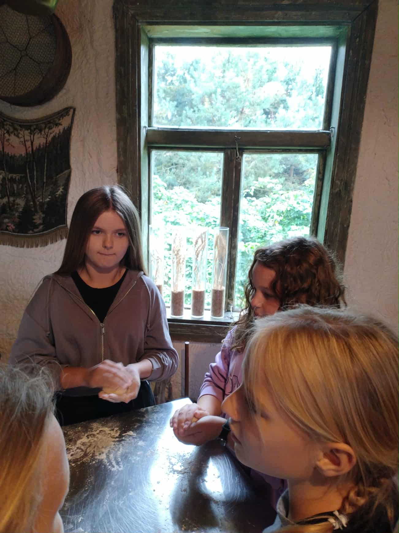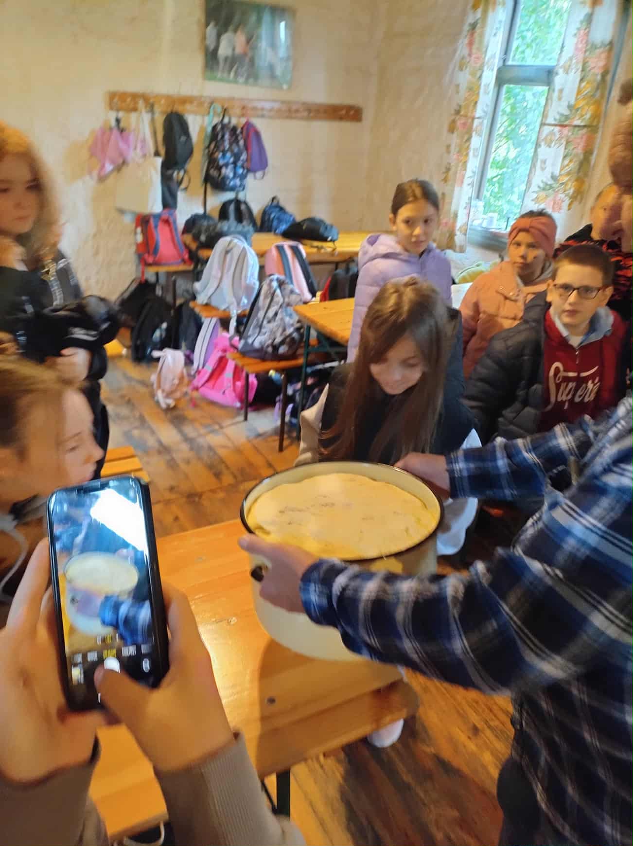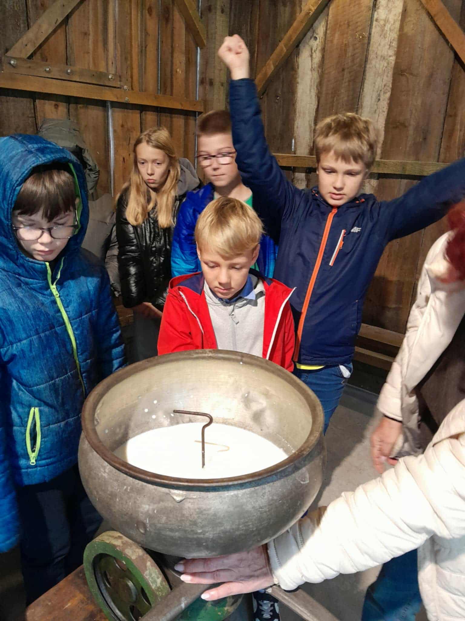 Następnie pojechaliśmy na warsztaty poświęcone tradycjom chłopskim do Białej Wielkiej do „Jurajskiej Spiżarni”. Podczas 3-godzinnego pobytu w gospodarstwie agroedukacyjnym specjalizującym się między innymi w prowadzeniu zajęć pokazujących życia dawnej wsi uczestniczyliśmy w warsztatach z tradycyjnego wypieku chleba, robienia śmietany, masła i sera. Zobaczyliśmy jak można rozniecić ogień za pomocą krzesiwa czy zmielić ziarno na mąkę na starych żarnach.