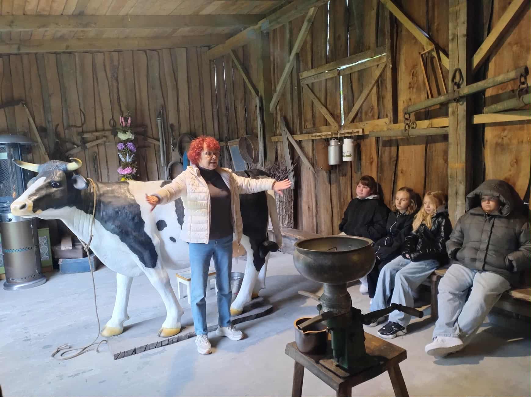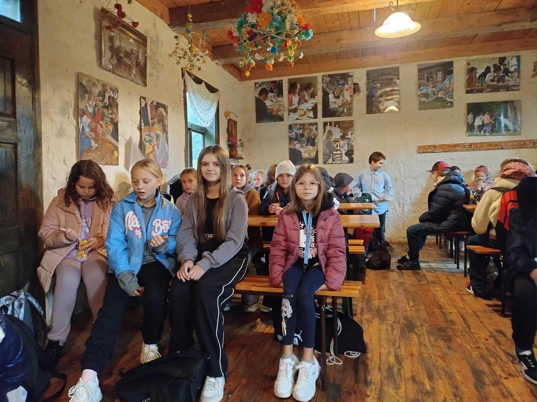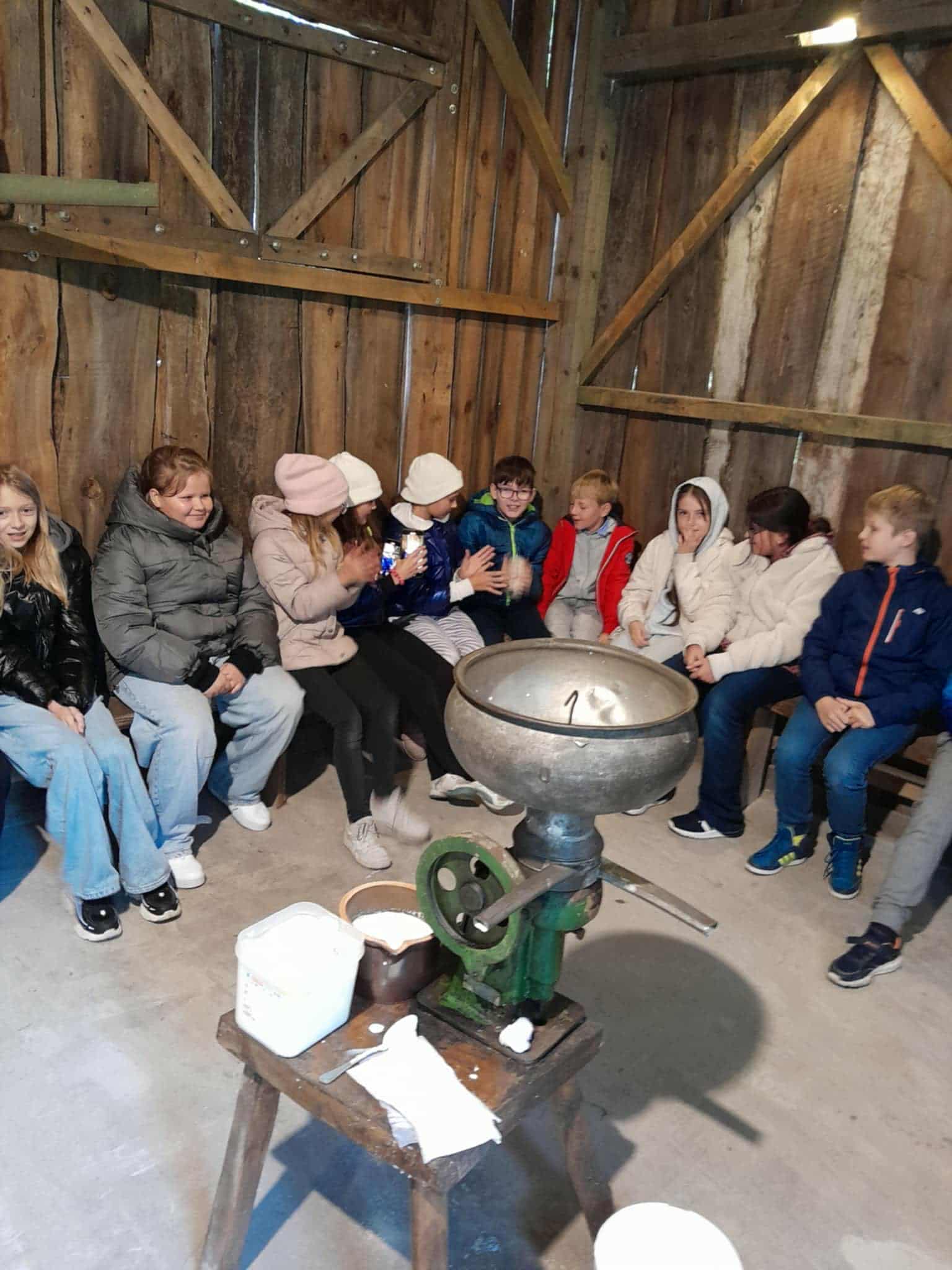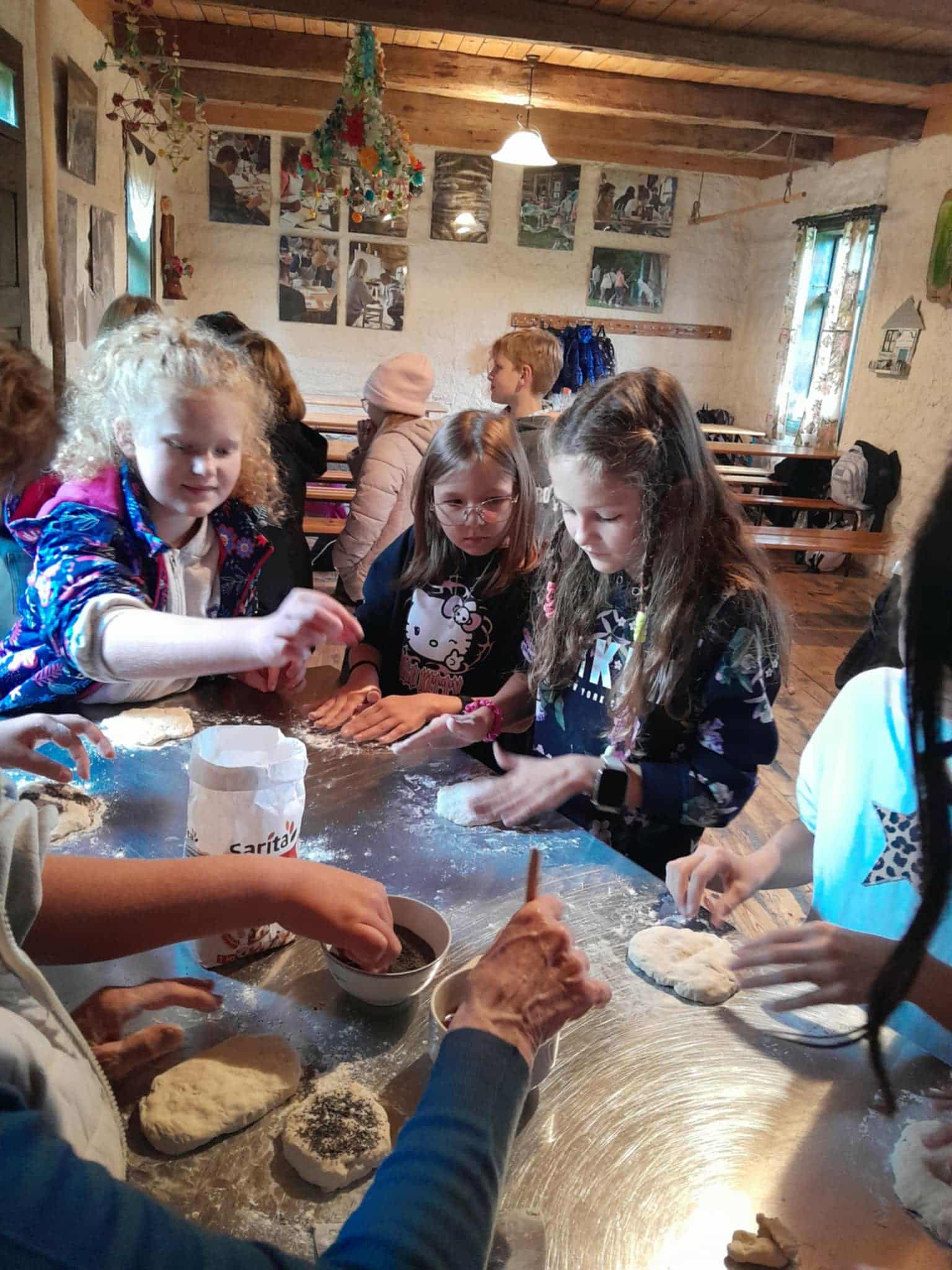 Następnie pojechaliśmy na warsztaty poświęcone tradycjom chłopskim do Białej Wielkiej do „Jurajskiej Spiżarni”. Podczas 3-godzinnego pobytu w gospodarstwie agroedukacyjnym specjalizującym się między innymi w prowadzeniu zajęć pokazujących życia dawnej wsi uczestniczyliśmy w warsztatach z tradycyjnego wypieku chleba, robienia śmietany, masła i sera. Zobaczyliśmy jak można rozniecić ogień za pomocą krzesiwa czy zmielić ziarno na mąkę na starych żarnach.